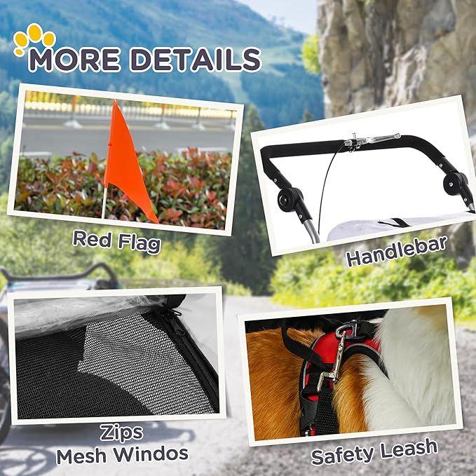 - Smooth Ride: Keep your dog bike trailer securely in place with a convenient and built-in hand-lock brake system. Two 20" rear wheels and a 360 degrees swivel universal front wheel provide a smooth ride. An attached flag provides high visibility in traffic and low-light conditions.