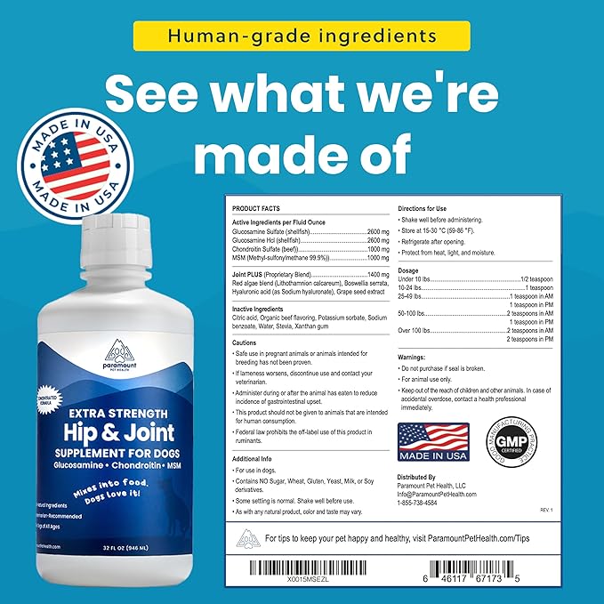 - Support for Happy, Active Dogs: Paramount Pet Health’s dog glucosamine and chondroitin supplement large dog keeps your dog moving comfortably with 5200mg glucosamine, chondroitin, and MSM, to support joint well-being and flexibility