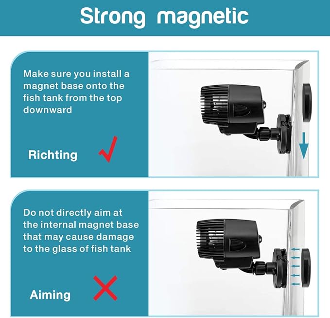 - EASY TO INSTALL: With a magnetic bracket which is easy to install and allows you to position the pump virtually anywhere in your aquarium. Forceful magnet, pay attention to the magnetic base to avoid pinching your hands when assembling