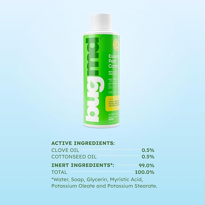 - Plant-Powered Formula: BUGMD utilizes the power of plant oils such as cottonseed oil and clove oil. BUGMD doesn't contain any harsh chemicals, so it's better for you and your family while you effectively control pest invasions. BUGMD is good to use on wood, carpet, and fabrics.
