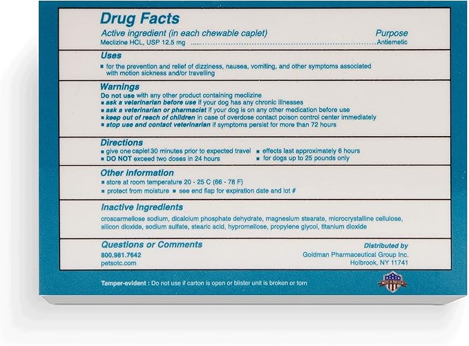 - Precautions: This medication should not be combined with any other medication or product containing Meclizine. As with all supplements and medications, be sure to consult with your veterinarian first.