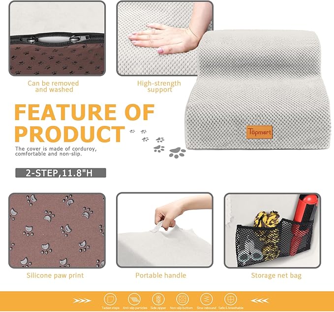 - Safer,Wider&Deeper Steps:Our dog stairs are excellent for those older dogs who are less mobile as they age or for cats with injuries. More wide and deep steps are helpful for reducing the strain that constantly jumping up and down onto lower bed,sofa can have on your pet's joints,and topmart dog steps will not shake and slip during use. The cover made of corduroy is more frictional than other covers, pets will not slip on the stairs.