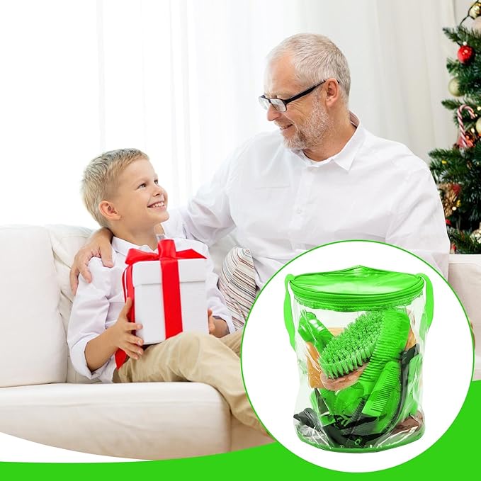 9 Pieces Horse Grooming Kit Tack Room Supplies Set with Organizer Tote Bag, Oval Massage Curry, Hard and Soft Brush, Hoof Pick, Sweat Scraper, Bathing Sponge, Combs for Horse Riders Beginners (Green)