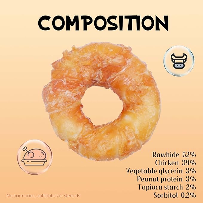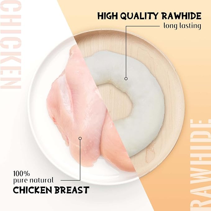 - LONG LASTING DOG CHEWS - Chicken Wrapped Rawhide Donuts allow a long-lasting and more fun chewing for your dogs. 4-inch donut shape provides chewing enjoyments for your puppy dog