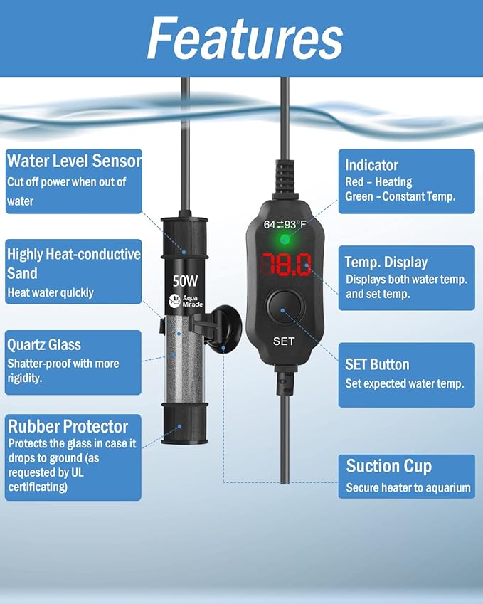 - DRY RUN / OVERHEATING PROTECTION – Full consideration of safety. With the multiple protections this fish tank heater will stop working when the water level is lower than the minimum water level (DRY RUN PROTECTION) or when the water temperature exceeds 97F (OVERHEATING PROTECTION). You are free from “cooking fish”!