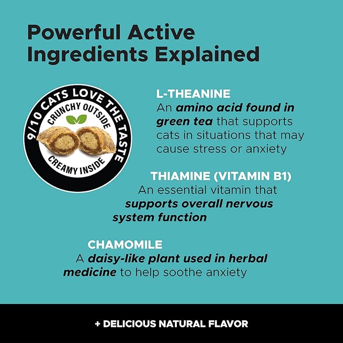 - Made with natural and premium ingredients like L-Theanine, L-Tryptophan, and Chamomile: Calming chews are filled with health-supporting ingredients you can trust. L-Theanine and L-Tryptophan support cats in situations that may cause stress or anxiety. Thiamine is an essential vitamin that supports overall nervous system function. Chamomile is often used in herbal supplement to help soothe anxiety. And theyโre all in a delicious chicken-flavored chew your cat will love!