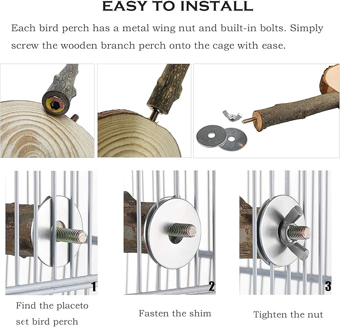 - Easy to install: Each bird stand comes with a metal wing nut and built-in bolts. Just fasten the wood branch perch easily onto the cage with the screw.