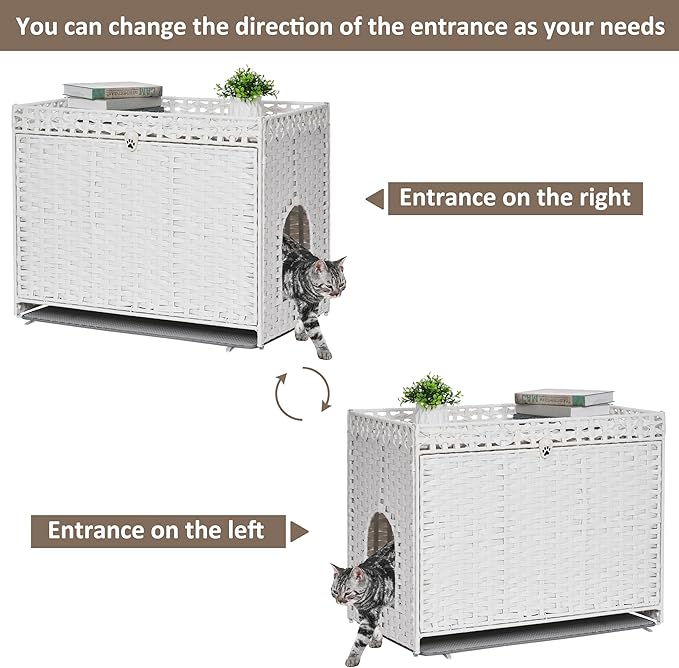 - 【Spacious room, Top fence design】Inner dimensions: 17.5” x 29.4” x 18.5”, it suits most litter boxes. The cat house is built with top rattan fence (height 2''), which can prevent pet bed from falling.