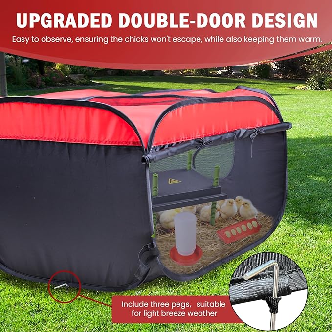 - INDOOR & OUTDOOR USE - Perfect for indoor or outdoor settings, this baby chick brooder features an advanced double-door design, three-sided mesh design, and escape-proof mesh. The warm curtains is perfect for outdoor, providing excellent cold protection. Indoors you can open the breathable mesh panels, which offer good ventilation to ensure a cool and comfortable environment. while also preventing the chicks from escaping. This playpen will keep your chicks safe, happy, and comfortable.