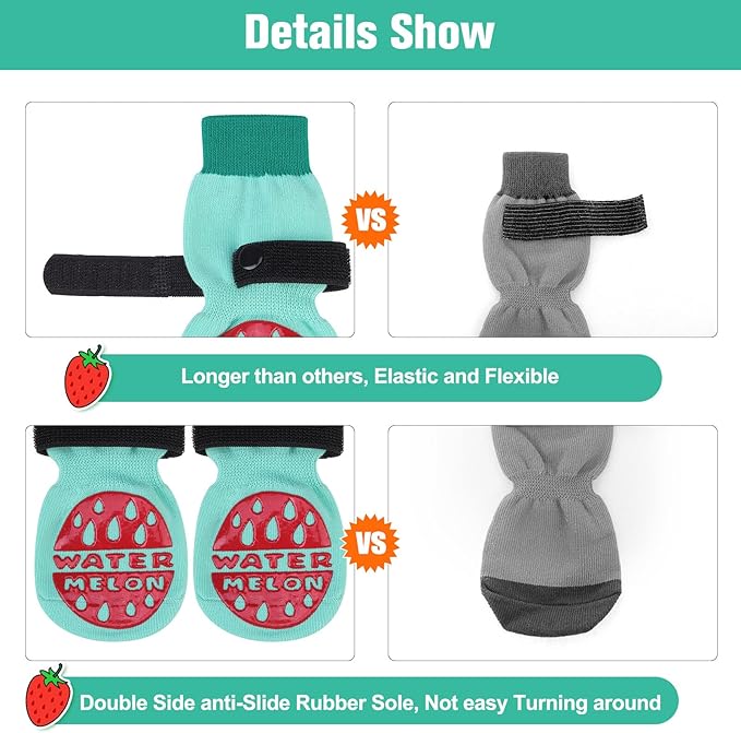 - Non-Skid: For hardwood floor, if your baby has problems who was splaying and keeps slipping on your wooden floors with back legs, we suggest you would buy these the soles which have anti-slip adhesive, which can provide extra traction. Besides, wearing a non skid sock prevents dogs from licking and irritating the wound further aid in healing foot wounds.??Please note we have design patent to protective this exclusive design!