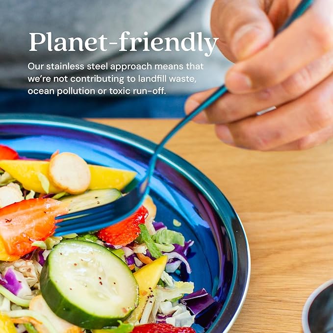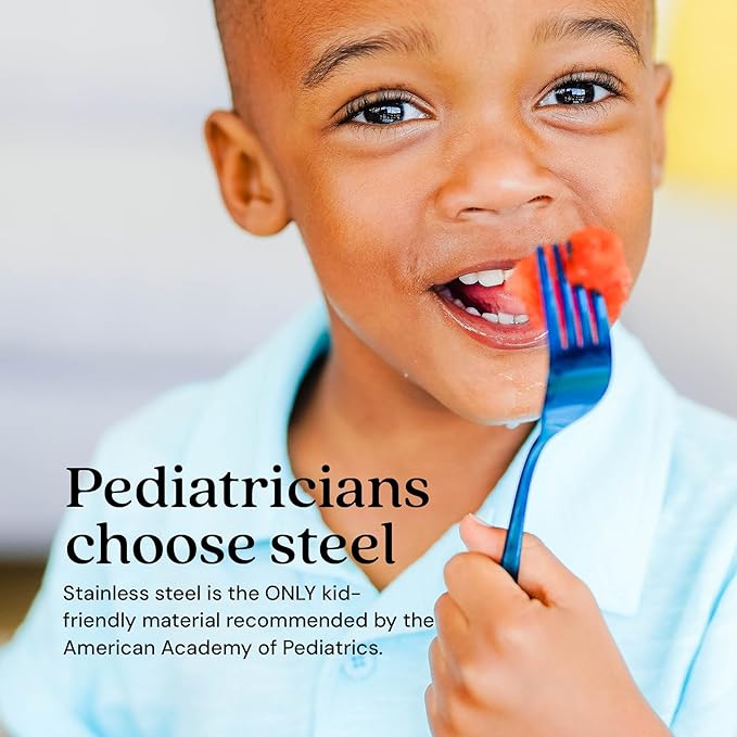 - Vibrant Colors — Ahimsa's stainless steel kids silverware set is a favorite among toddlers and big kids alike, with stunning and colorful finishes including rainbow, iridescent blue and our classic steel. These impressive toddler forks and spoons will quickly become your child’s new favorite eating utensils.