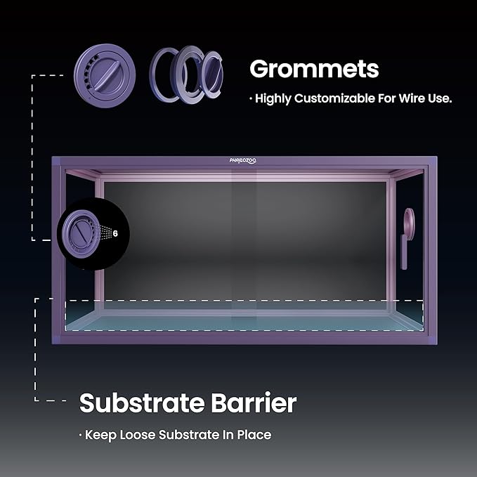 - 【Easy Maintenance】Front opening reptile terrarium with door handles included for easy cleaning & feeding. No more suction cup problems or unsightly fingerprints all over. The substrate barrier keeps the substrate in place. Our tempered glass doors are durable enough to withstand scratching.