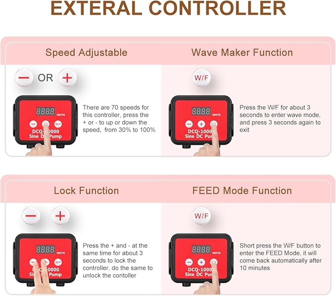 - DC24V Controllable Aquarium pump:100 speed adjustable,LCD display the speed,,wattage and working status,can adjust the flow from 40% to 100% of max flow,with 10 minutes feeding mode and wave maker mode