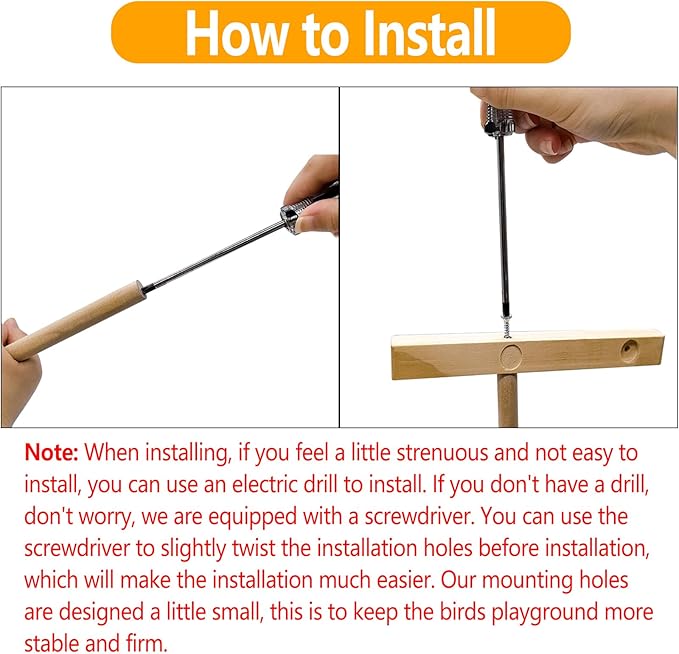 - 【Warm Reminder】Dear customers, in order to ensure the stability of the bird perch, the small holes for screwing the screws in our wooden sticks may be relatively small, which may make it a bit difficult for you to screw the screws. We apologize for any inconvenience this may cause.