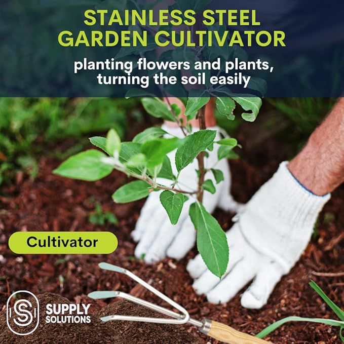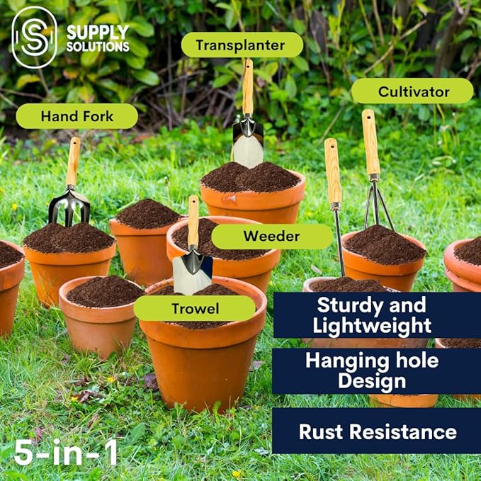 - Convenient 5 piece tool kit: Tackle any home and garden task with ease using our heavy-duty and ergonomic gardening supplies - including hand trowel, transplanter, fork, rake, and cultivator. Ideal for both indoor and outdoor gardening work.