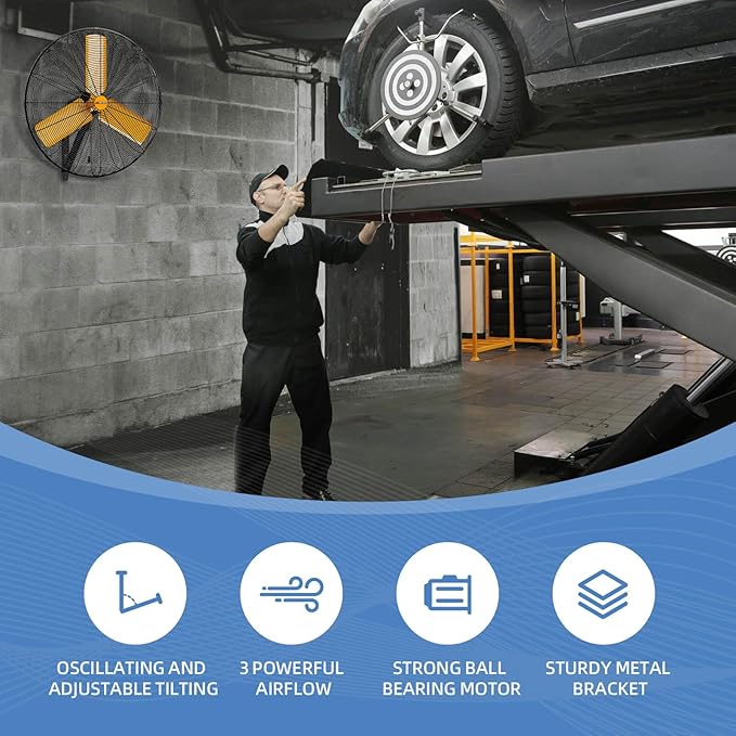 24 inch Oscillating High Velocity Wall Mount Fan, 7600 CFM Industrial Heavy Duty Metal Wall Fan, 3 Speeds, Adjustable Height and Tilt, Commercial Shop Fans for Garage, Workshop