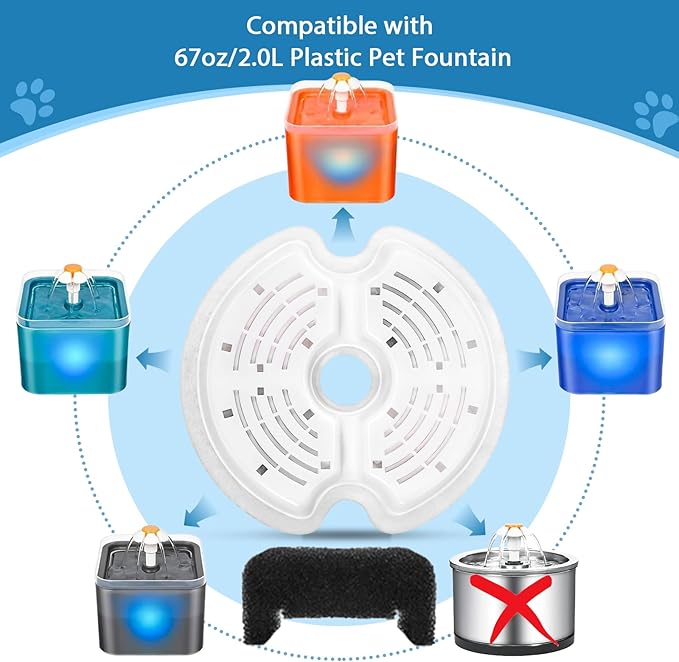 - Wide Compatibility: Compatible with Stainless Steel84oz/2.5L Stainless Steel Pet Fountain and 67oz/2.0L Plastic Pet Fountain.