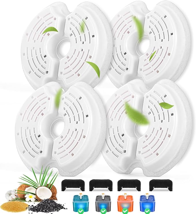 Cat Water Fountain Filters for 84oz/2.5L Stainless Steel Pet Fountain and 67oz/2.0L Plastic Cat Drinking Fountain, 4 Pack Pet Replacement Filters with 4 Pre-Filter Sponges