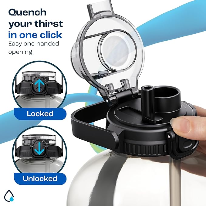 - 2-in-1 Chug & Straw Lid - Our one-gallon water jug comes with a dual functionality lid that allows you to chug or sip without having to change the lid. The smart, off-centre placement of the lid lets you use both the spouts with ease - sip while you work and chug after a rigorous workout!