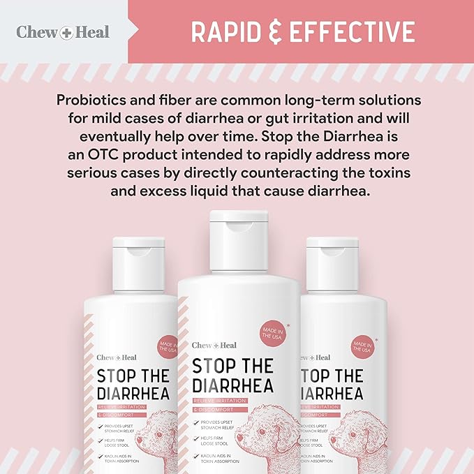Chew + Heal Labs Anti Diarrhea for Dogs - 12 oz. of Stop The Diarrhea Liquid Supplement with Kaolin for Upset Stomach Relief - Made in The USA