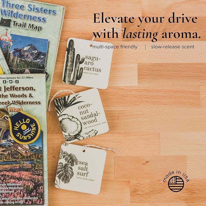 - Botanical Variety Pack: Enjoy a delightful mix of 6 car fresheners with our variety pack, featuring 2 Coconut Sandalwood, 2 Saguaro Cactus, and 2 Sea Salt Surf scents. Perfect for bringing a refreshing botanical aroma to your drive.