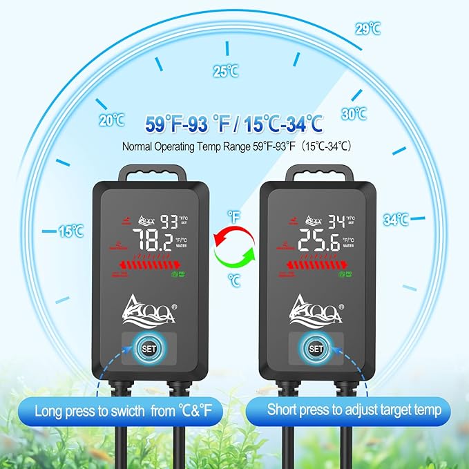 - Intelligent Automatic Heating: The AQQA fish tank heater adopts automatic constant temperature control. When water temp reaches the set temp, it will stops heating; when the water temp falls lower than the set temp by 2℃/°F, it will automatically heat up again; Memory function allows no need to reset the temperature after a power outage, so it is more convenient to unplug and change the water.
