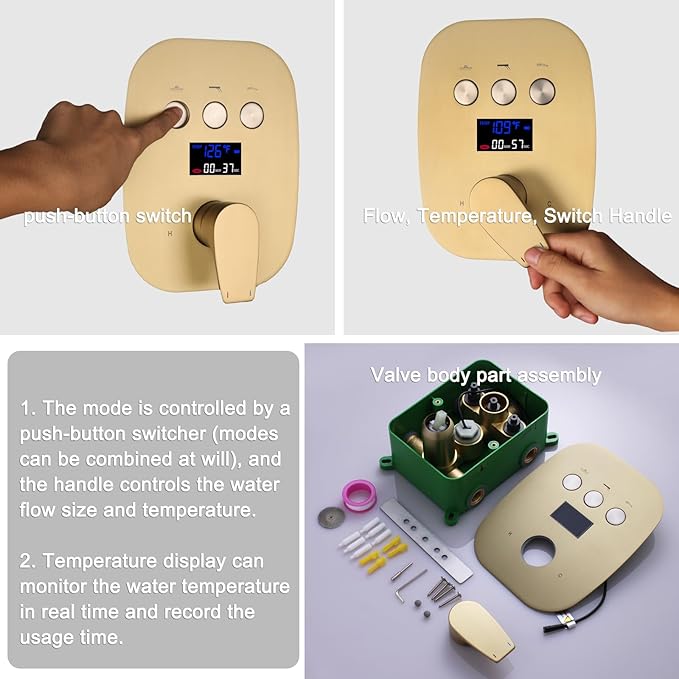 - Temperature digital display(no power or battery required): rain shower system design update, shower valve uses a hydro generator, built-in LCD digital temperature display(°F), easy to monitor temperature