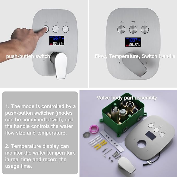 - Temperature digital display(no power or battery required): rain shower system design update, shower valve uses a hydro generator, built-in LCD digital temperature display(°F), easy to monitor temperature