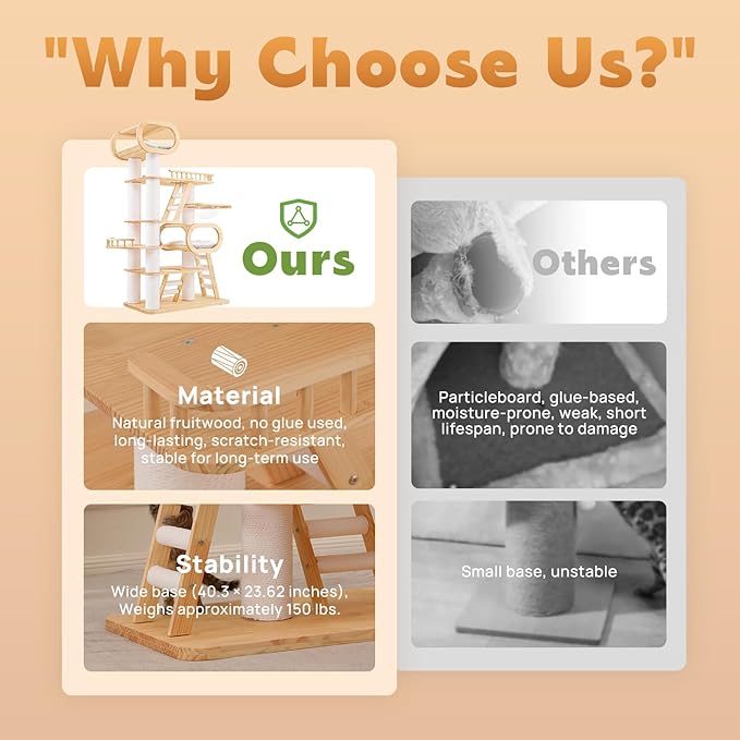 - Natural Pine Wood: KZLAA Tall Cat Tower weighs approximately 149 pounds and is made of natural pine wood and natural sisal, safe materials with no odor and will not cause harm to people and pets.