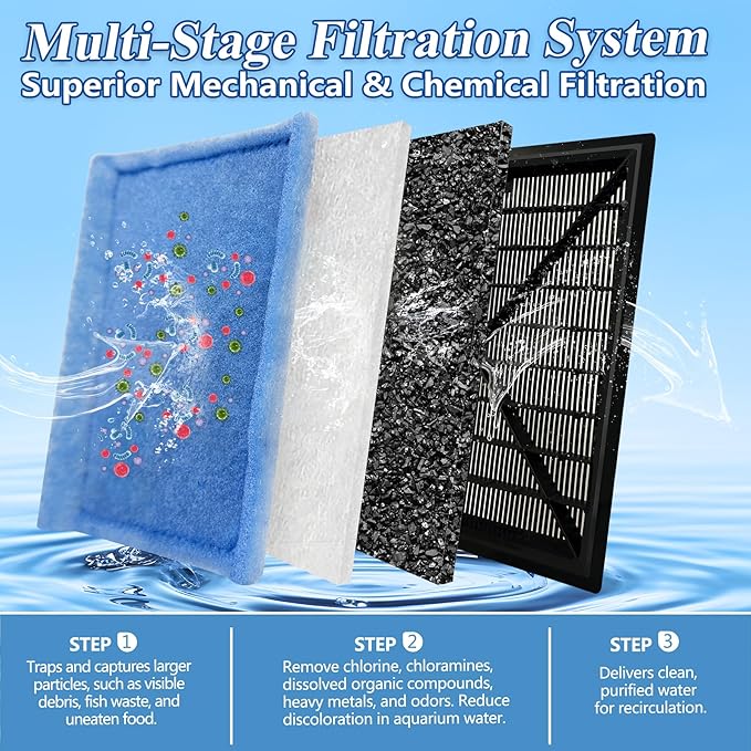 - Premium Aquamium Filter Media: The fish tank filter cartridge features a high-quality double-layer aquarium filter pad and granules of a blend of premium activated carbon and zeolite, delivering multi-stage filtration to keep your aquarium water crystal clear. The dual adsorption granules are evenly distributed, maximizing water contact to enhance filtration efficiency.