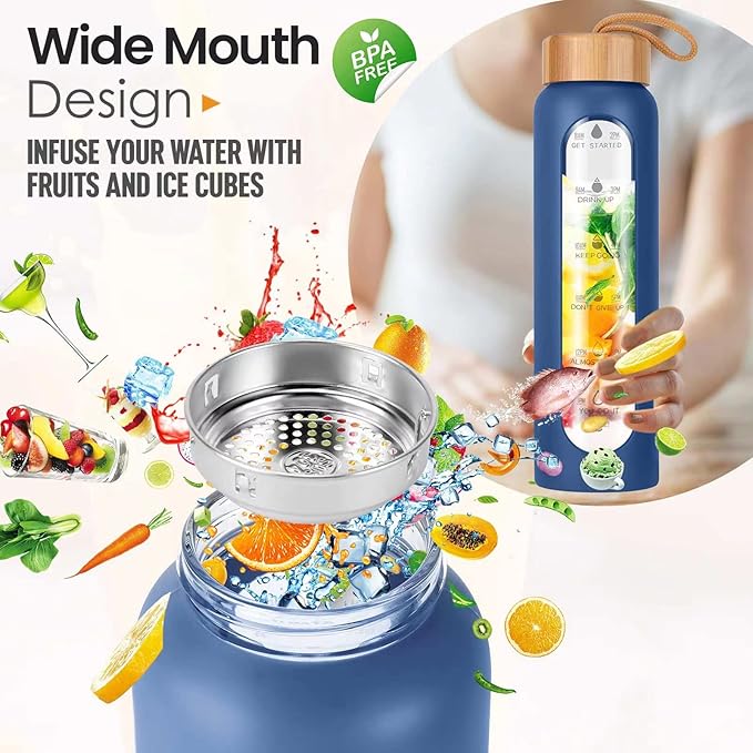 Aqulea Glass Water Bottles 25 Oz with Silicone Sleeve - BPA Free Reusable Wide Mouth Glass Motivational Water Bottles with Fruit Infuser – Leak Proof Borosilicate Water Bottle with Time Marker (Blue)