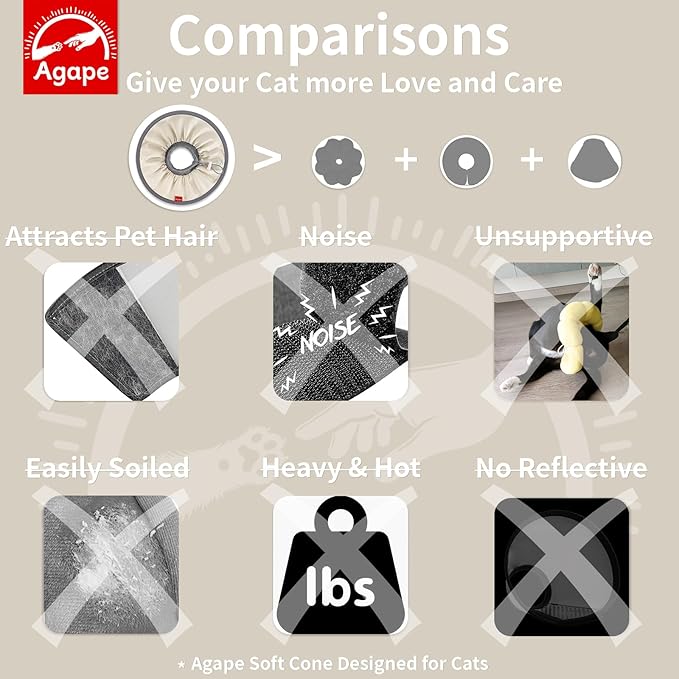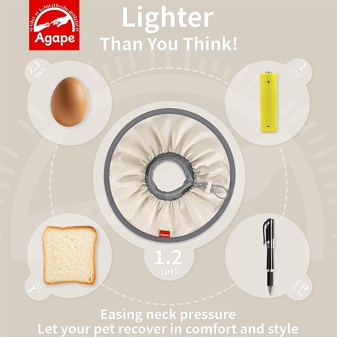 - 【Soft & Lightweight】Unlike bulky, uncomfortable cones on the market, Agape's cat cone is made with two layers of silky fabric and a ribbed knit collar, weighing just 1.2 ounces—about the same as two single AA battery. This ultra-light, breathable, and soft design ensures your cat can sleep peacefully and comfortably, without feeling any strain or restriction around their neck