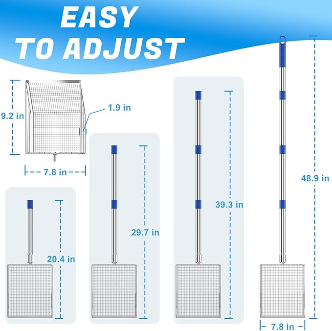 - 4-in-1 Adjustable Handle for Flexible Cleaning: The stainless steel handle features four adjustable lengths: 20.4", 29.7", 39.3", and 48.9", catering to different cleaning tasks and user heights. Ideal for cleaning chicken litter, rabbit droppings, and cat boxes, as well as collecting beach shells.
