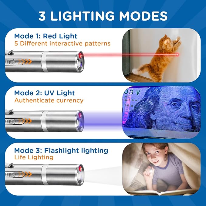 - Multiple Function: The cat light can also make you a presenter. It is bright that you can see clearly, making speeches or explanations easier and more convenient. What’s more, you can turn on the switch with a single press instead of holding down on the button to keep lighting like most other cat flashlight do. Lighting mode can glow in the dark. Purple mode can detect counterfeit money.