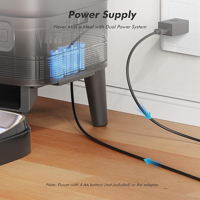 - Dual Power Supply: Powered by either a Type-C adapter or 4 AA batteries (not included), this automatic feeder keeps meals coming even during power outages—so your pet never goes hungry. It also includes a durable, chew-resistant 1.5-meter nylon cable for flexible and worry-free placement.