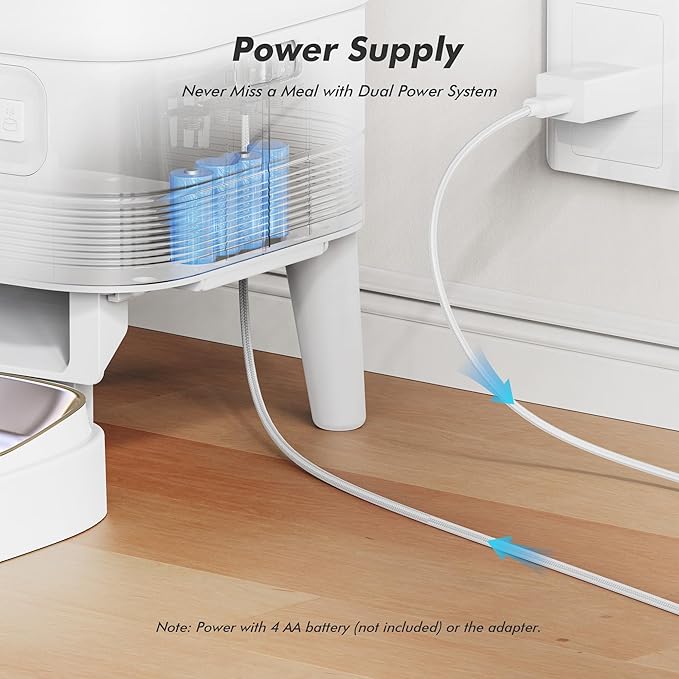 - Dual Power Supply: Powered by either a Type-C adapter or 4 AA batteries (not included), this automatic feeder keeps meals coming even during power outages—so your pet never goes hungry. It also includes a durable, chew-resistant 1.5-meter nylon cable for flexible and worry-free placement.