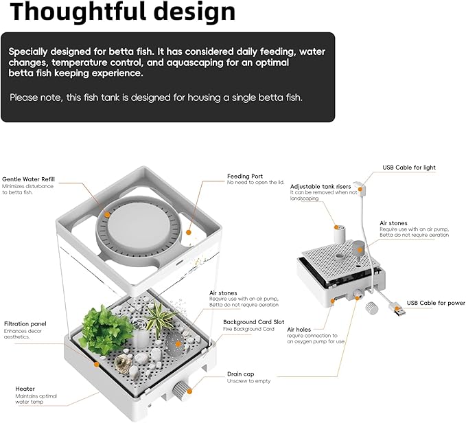 - 【Heating System】Equipped with an automatic heating system 68-86°F (20-30°C)that maintains the perfect water temperature for your betta's well-being