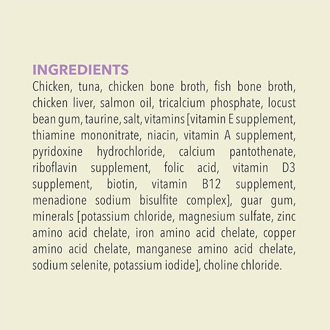 - High protein cat food recipe includes 85 percent** animal ingredients and features raw* chicken, tuna, chicken bone broth, fish bone broth, chicken liver and salmon oil