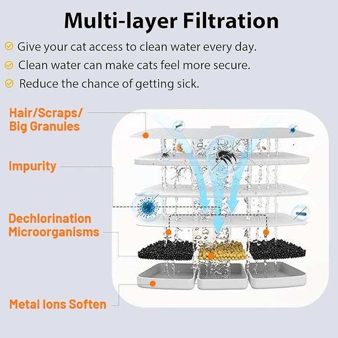 - Multiple Filtration: Every drop of water is filtered through a vertical filtration system to remove all impurities and provide oxygen-rich and better-tasting water. In our catit water fountain, the activated carbon removes odors and bad tastes, while the filter mesh captures hair and larger debris. The pump's high-density porous filter cotton eliminates fine particles, ion exchange resin softens tap water, and medical stones remove heavy metals while releasing beneficial trace elements.