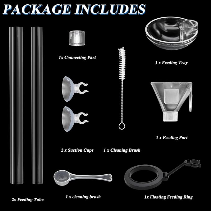 - Package Includes: 1x feeding tube, 1 x feeding tray, 1x floating feeding ring, 1 x cleaning brush, 1x feeding spoon, 2 x suction cups, a complete feeding set, no need to buy other accessories separately