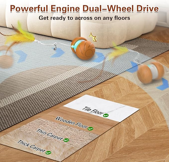 - Super Power Robot - Play On Any Floor: Powerful engine & dual-wheel drive umosis interactive cat toy to easily cross over wooden / tile floors /low carpets/ thick carpets.Perfect for indoor play to keep bored cats active and engaged.