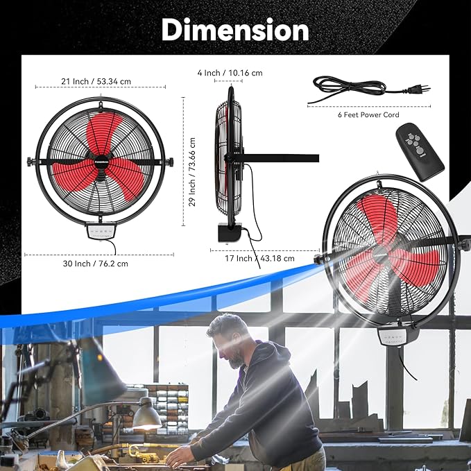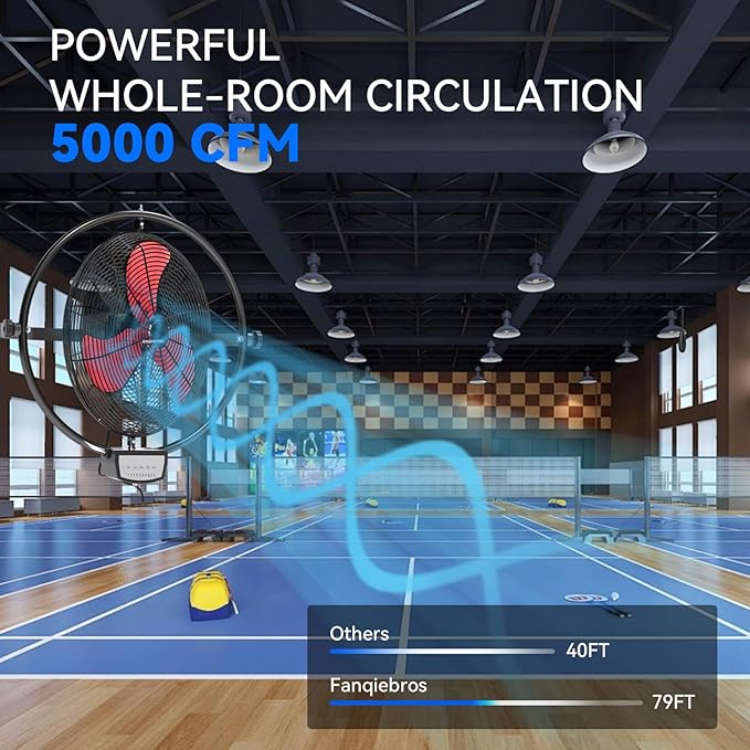- 𝐋𝐨𝐰-𝐍𝐨𝐢𝐬𝐞 𝐃𝐞𝐬𝐢𝐠𝐧 - With optimized motor and vibration reduction technology. When running at a high speed of 5000 CFM, the noise level is only 59 dB, this wall fan is lower than the industry standard, creating a quieter gathering or working environment