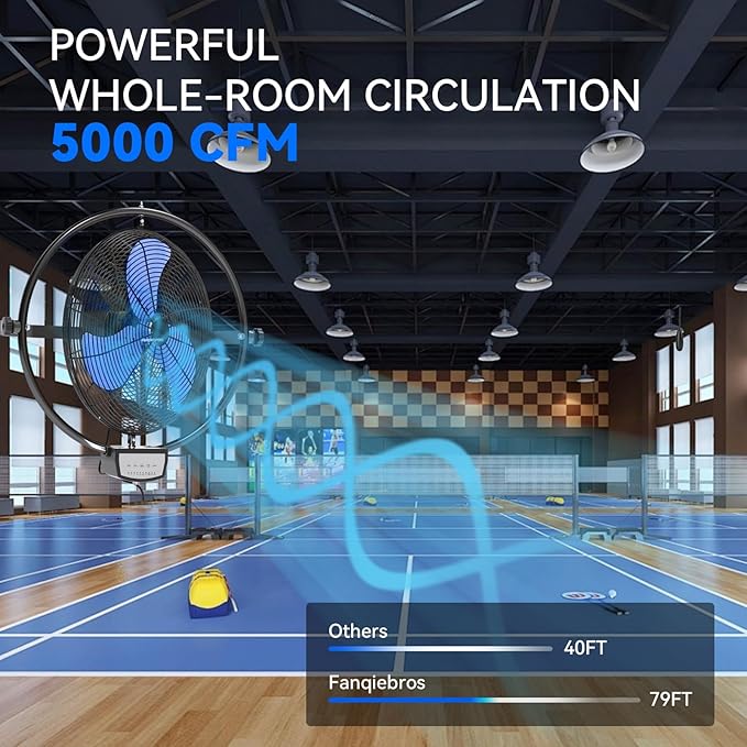- 𝐋𝐨𝐰-𝐍𝐨𝐢𝐬𝐞 𝐃𝐞𝐬𝐢𝐠𝐧 - With optimized motor and vibration reduction technology. When running at a high speed of 5000 CFM, the noise level is only 59 dB, this wall fan is lower than the industry standard, creating a quieter gathering or working environment