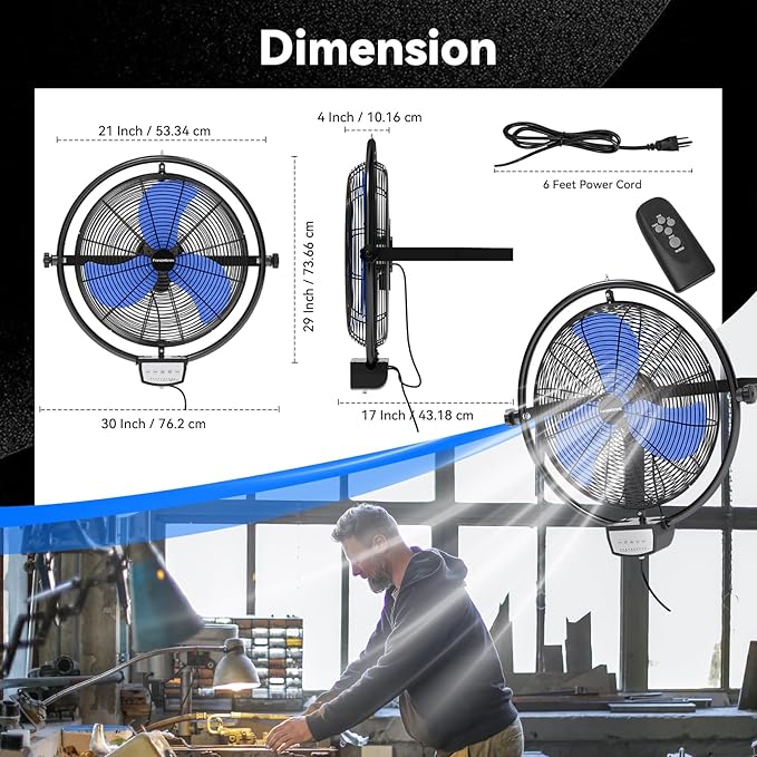 - 𝐇𝐢𝐠𝐡 𝐕𝐞𝐥𝐨𝐜𝐢𝐭𝐲 𝐀𝐢𝐫 𝐅𝐥𝐨𝐰 - The heavy duty wall fan design makes the operation more intuitive and simple, and the high, medium and low speeds can be adjusted by the remote control to meet different needs. High speed 5500 CFM, medium speed 4000 CFM, low speed 3800 CFM, providing hurricane-like airflow to meet your garages, shops or outdoor use(Note: used on a covered patios or porch, BUT NOT EXPOSED TO RAIN)
