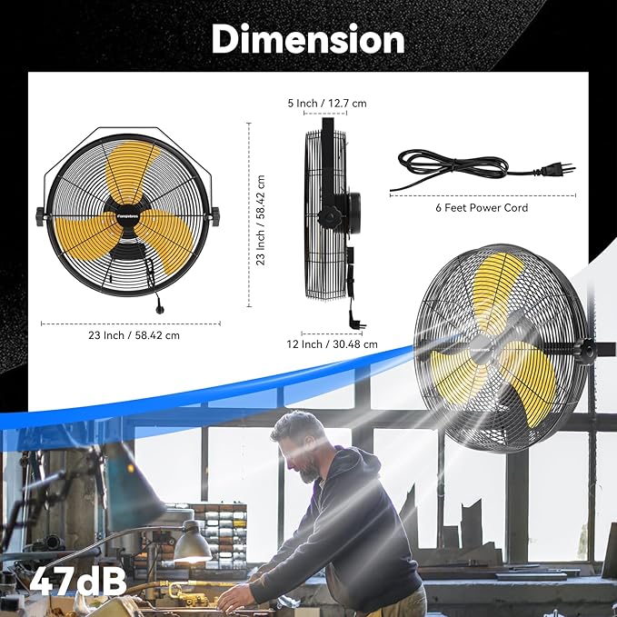 - 𝐇𝐞𝐚𝐯𝐲-𝐃𝐮𝐭𝐲 𝐒𝐭𝐫𝐮𝐜𝐭𝐮𝐫𝐞 - Industrial Wall Fan adopts industrial-grade heavy-duty construction, sturdy and durable. Zipper design makes operation more intuitive and simple, aluminum blades enhance wind output, rust-proof grille is safe to use and easy to clean. Extra long 6 feet + SJT waterproof power cord, 1/6 HP, 120V, 116Watts, 60Hz. Meets OSHA standards. UL safety certification