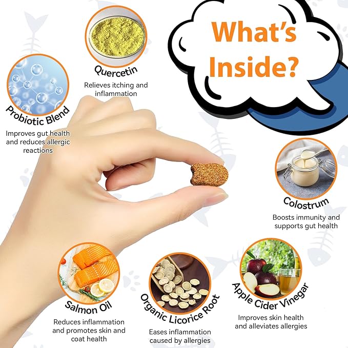- Targeted Allergy & Itch Relief for Cats - Our cat allergy relief chews are specifically designed to relieve itching, scratching, and paw licking caused by various allergies. They help calm your catโs skin, ensuring comfort and reducing allergic reactions.