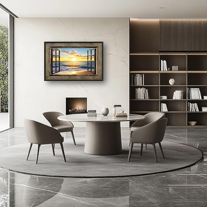 - 【Unique Design】A window frame with an ocean and sunset view, a beach scene with wooden frames, wall art for home decor, a beach landscape with open windows, photo-realistic, hyperrealism, high resolution.