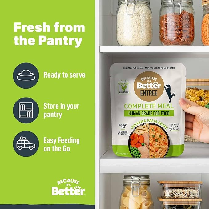 Because it's Better Entrée Complete Meal, Chicken & Pasta Recipe, Human Grade Wet Dog Food, 10 oz Pouches, 6 Count