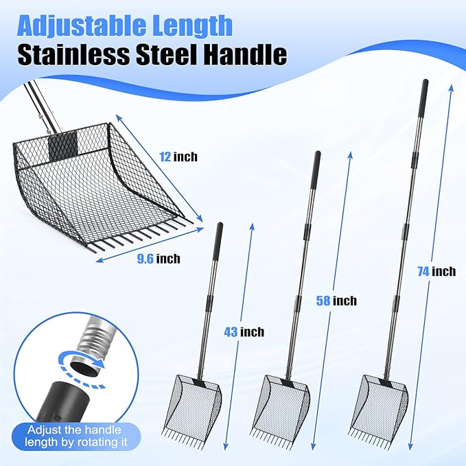 - Multi-funtion Sifter Shovel - This sifting shovel can be used for large-scale cleaning work in chicken coops, and can be used as a rake to clean chicken feathers or litter in the chicken coop, also can be adjusted to the right length to be used as a cat litter scooper, beach search sand scoop and cow pens shovel, etc