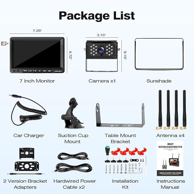 - 7 Inch Monitor Supports 4 Channels: This wireless rv backup camera system supports up to 4 cameras simultaneously, giving you a very comprehensive view of almost all blind spots on a RV. You can add more cameras as need by search "B0DGF5GTY8". The 7 inch TFT-LCD monitor presents high-definition images for reversing or monitoring day and night.